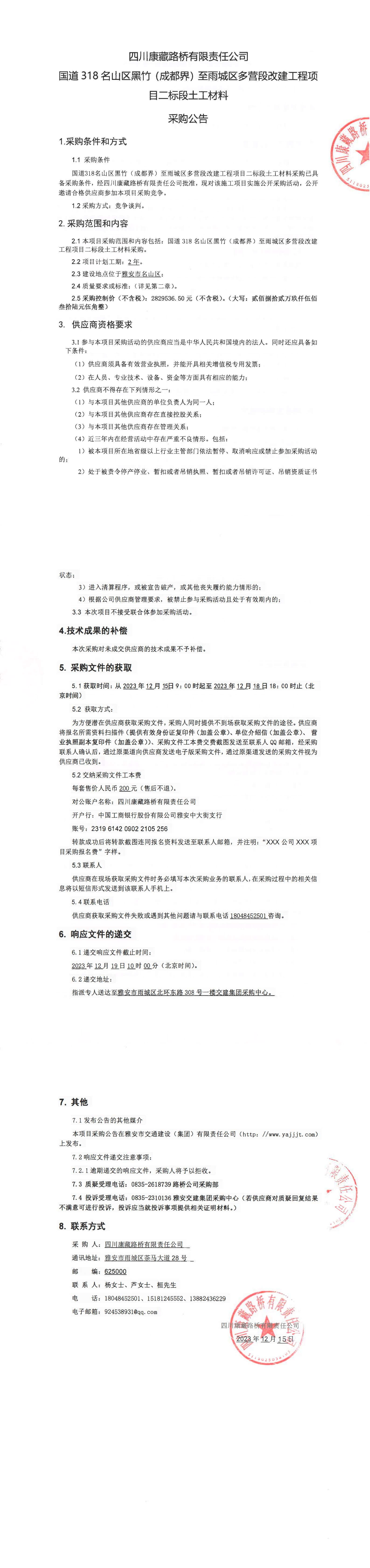 四川康藏路橋有限責(zé)任公司國道318名山區(qū)黑竹(成都界)至雨城區(qū)多營段改建工程項目二標(biāo)段土工材料采購公告