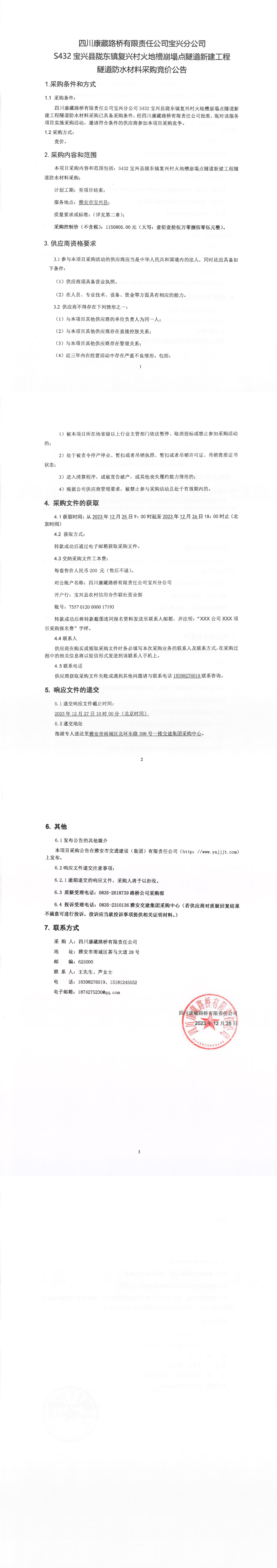 四川康藏路橋有限責(zé)任公司寶興分公司S432寶興縣隴東鎮(zhèn)復(fù)興村火地槽崩塌點(diǎn)隧道新建工程隧道防水材料采購(gòu)競(jìng)價(jià)公告