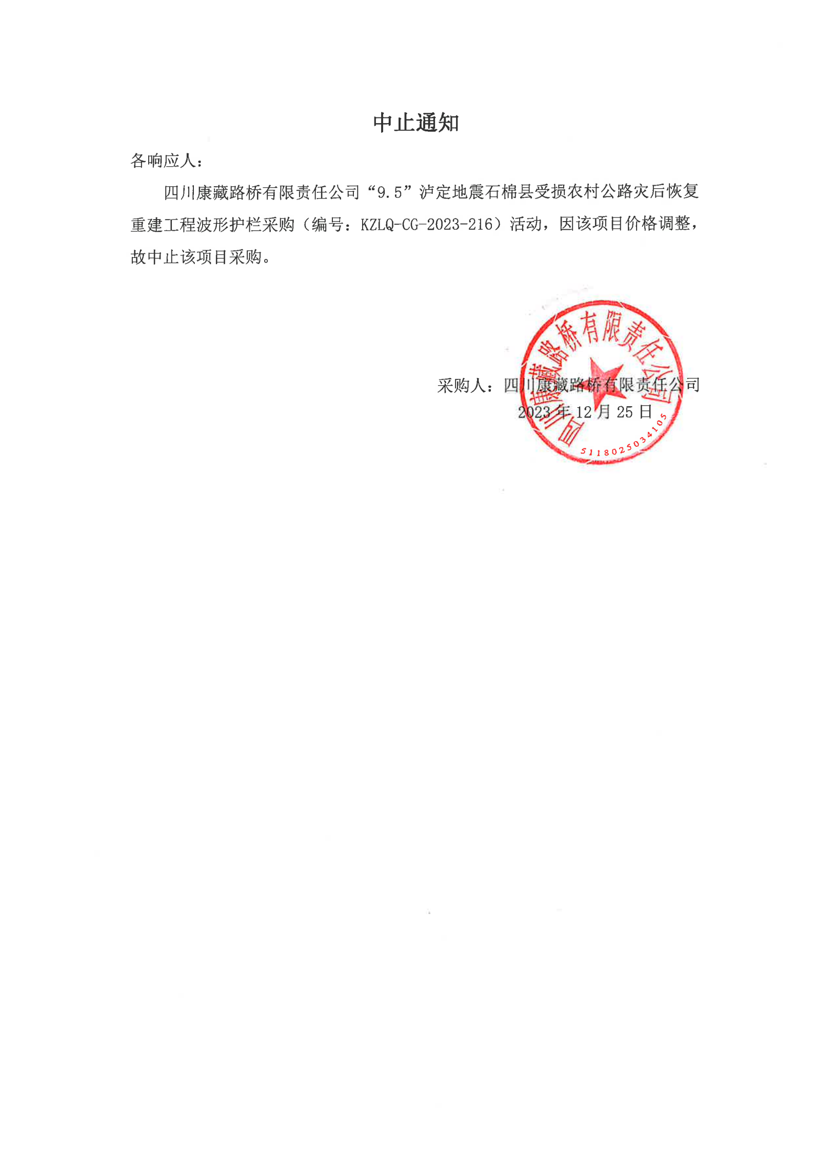 四川康藏路橋有限責(zé)任公司“9.5”瀘定地震石棉縣受損農(nóng)村公路災(zāi)后恢復(fù)重建工程波形護(hù)欄采購中止通知