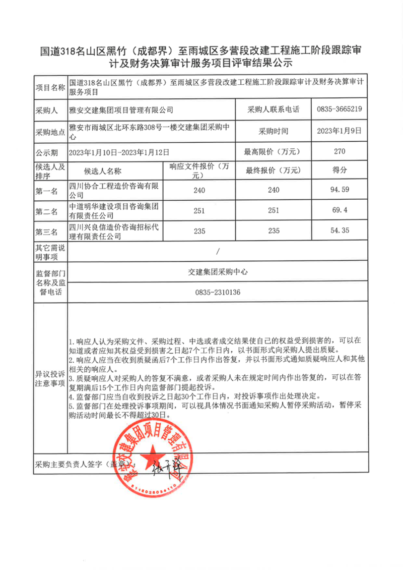 雅安交建集團(tuán)項目管理有限公司國道318名山區(qū)黑竹(成都界)至雨城區(qū)多營段改建工程施工階段跟蹤審計及財務(wù)決算審計服務(wù)項目評審結(jié)果公示