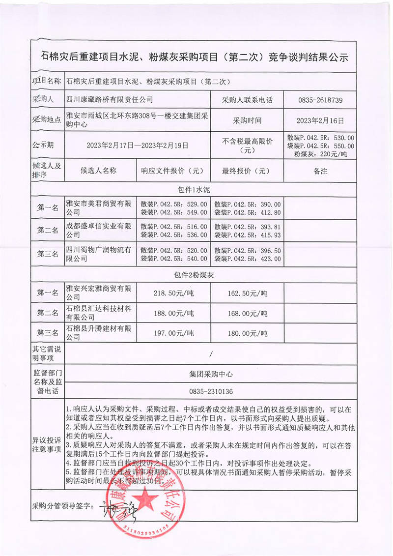 四川康藏路橋有限責任公司石棉災后重建項目水泥、粉煤灰采購項目(第二次)競爭談判結(jié)果公示