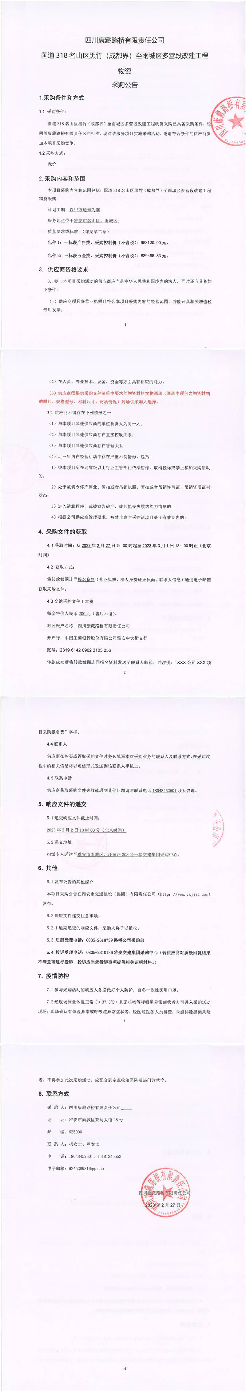 四川康藏路橋有限責(zé)任公司國(guó)道318名山區(qū)黑竹(成都界)至雨城區(qū)多營(yíng)段改建工程物資采購(gòu)公告