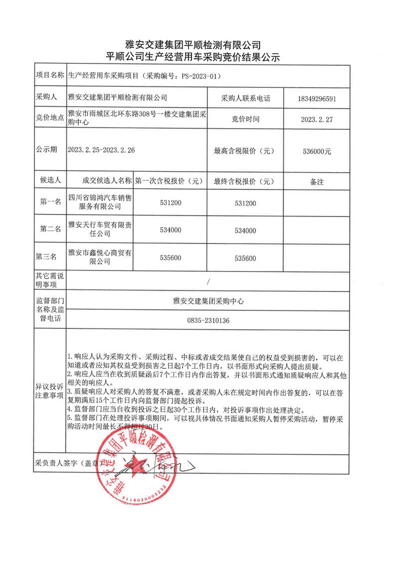 雅安交建集團(tuán)平順檢測有限公司平順公司生產(chǎn)經(jīng)營用車采購競價結(jié)果公示