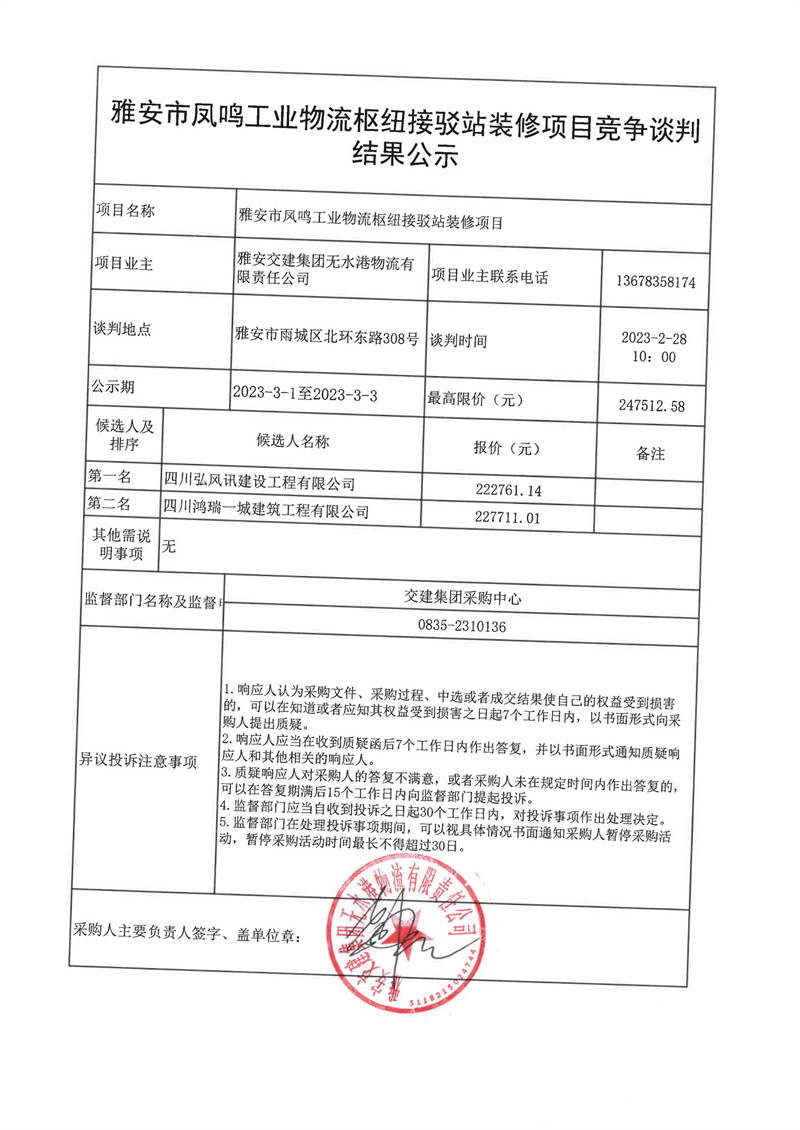 雅安交建集團(tuán)無水港物流有限責(zé)任公司雅安市鳳鳴工業(yè)物流樞紐接駁站裝修項目競爭談判結(jié)果公示