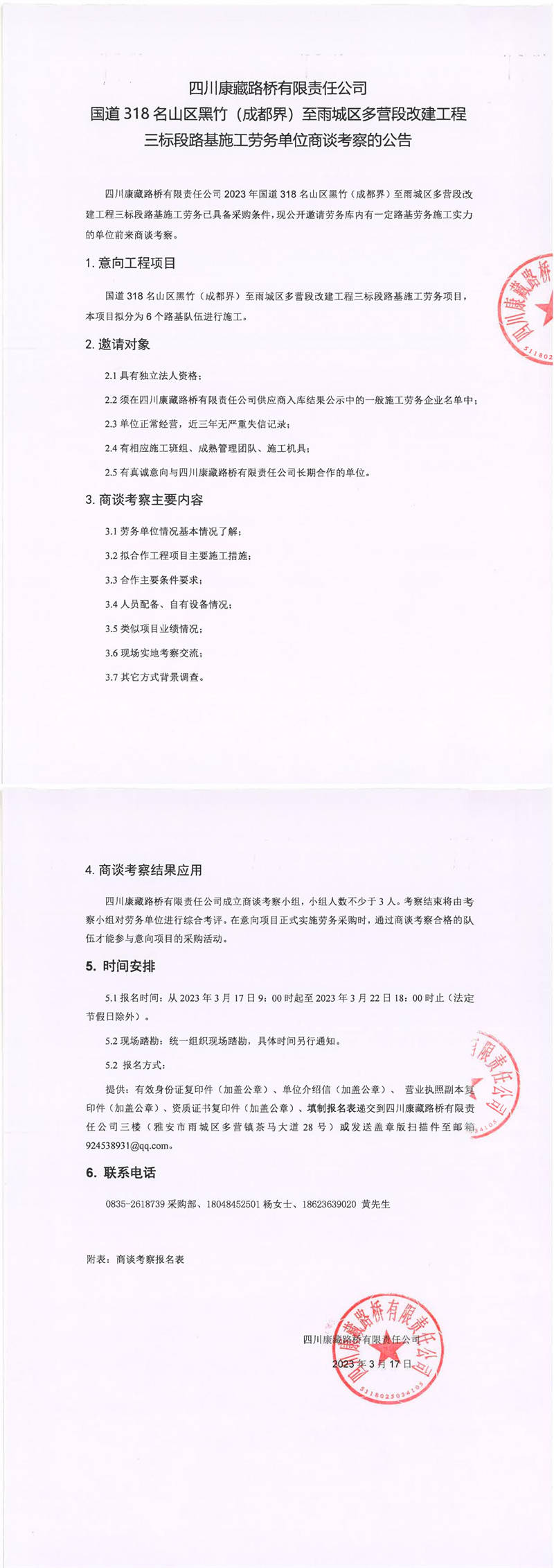 四川康藏路橋有限責任公司國道318名山區(qū)黑竹(成都界)至雨城區(qū)多營段改建工程三標段路基施工勞務單位商談考察的公告