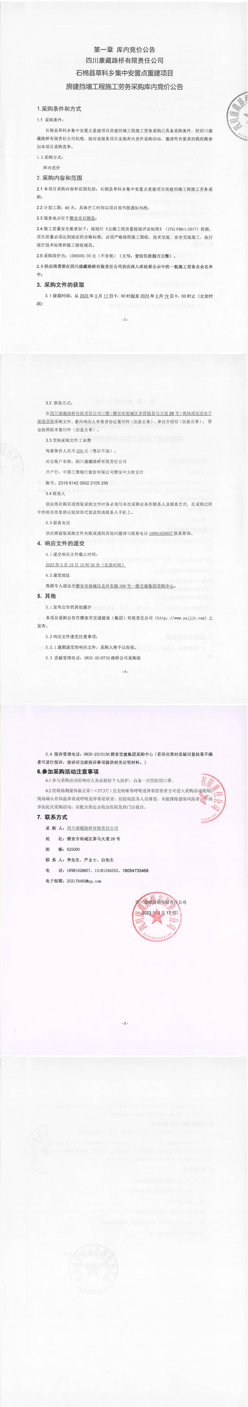 四川康藏路橋有限責(zé)任公司石棉草科鄉(xiāng)集中安置點(diǎn)重建項(xiàng)目房建擋墻工程施工勞務(wù)采購(gòu)庫(kù)內(nèi)競(jìng)價(jià)公告
