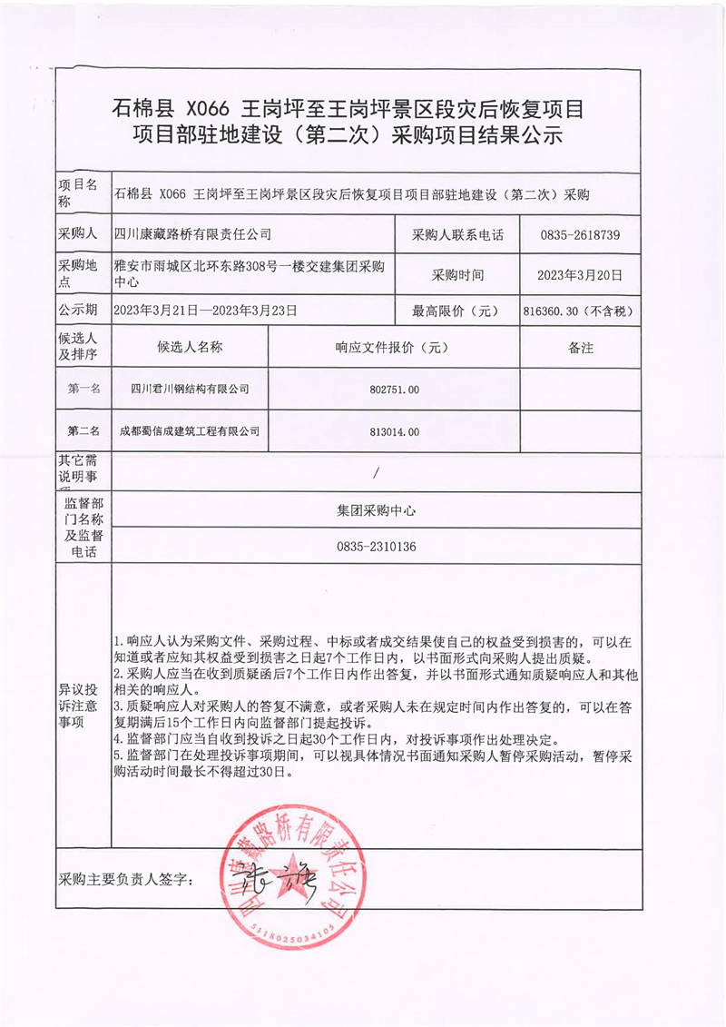 四川康藏路橋有限責(zé)任公司石棉縣X066王崗坪至王崗坪景區(qū)段災(zāi)后恢項目項目駐地建設(shè)(第二次)采購結(jié)果公示