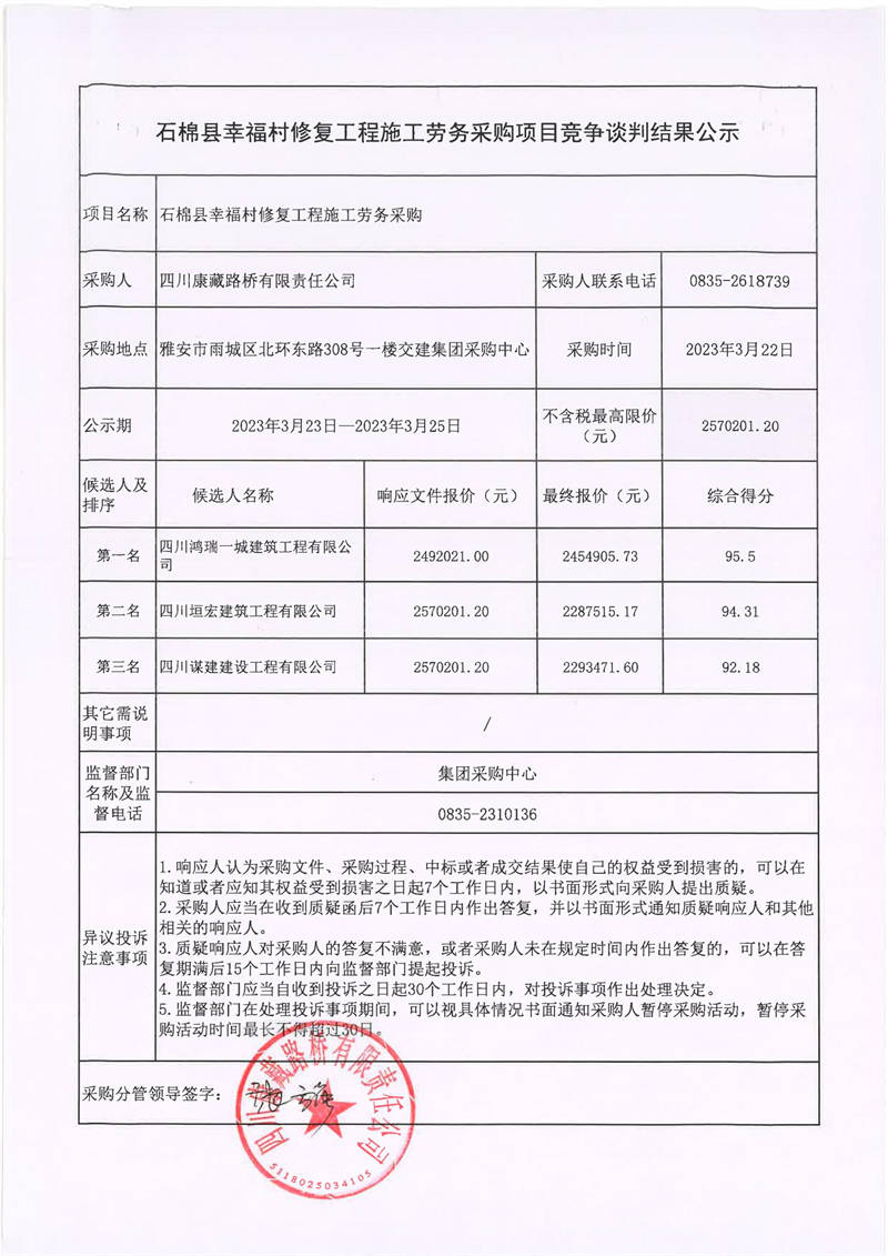 四川康藏路橋有限責任公司石棉縣幸福村修復工程施工勞務(wù)采購項目競爭談判結(jié)果公示