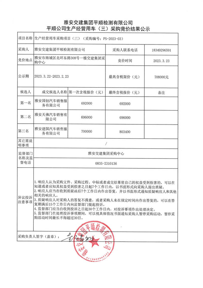 雅安交建集團(tuán)平順檢測有限公司平順公司生產(chǎn)經(jīng)營用車(二)采購競價結(jié)果公示