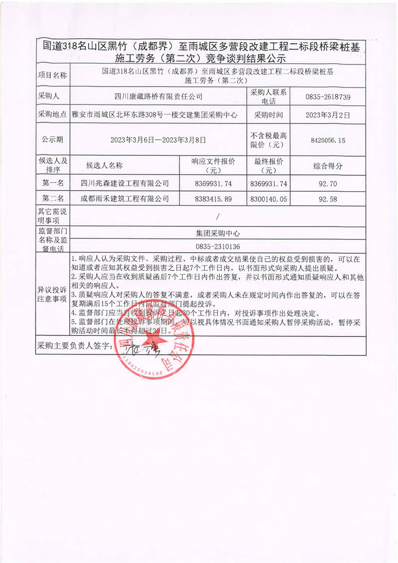 四川康藏路橋有限責任公司國道318名山區(qū)黑竹(成都界)至雨城區(qū)多營段改建工程二標段橋梁樁基施工勞務(wù)(第二次)競爭談判結(jié)果公示
