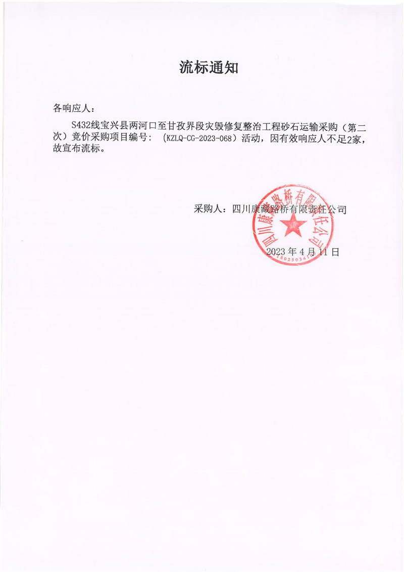四川康藏路橋有限責(zé)任公司寶興分公司S432寶興縣兩河口至甘孜界段災(zāi)毀修復(fù)整治工程砂石運(yùn)輸采購(第二次)流標(biāo)通知