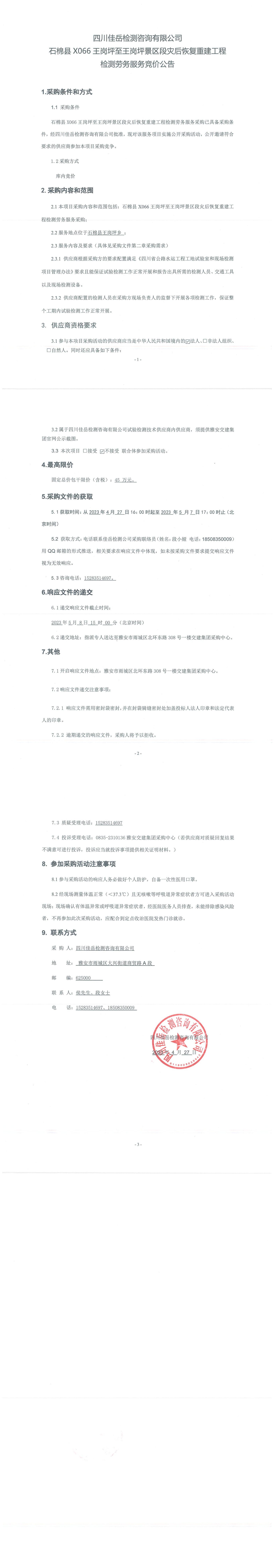 四川佳岳檢測咨詢有限公司石棉縣X066王崗坪至王崗坪景區(qū)段災(zāi)后恢復(fù)重建工程檢測勞務(wù)服務(wù)競價公告