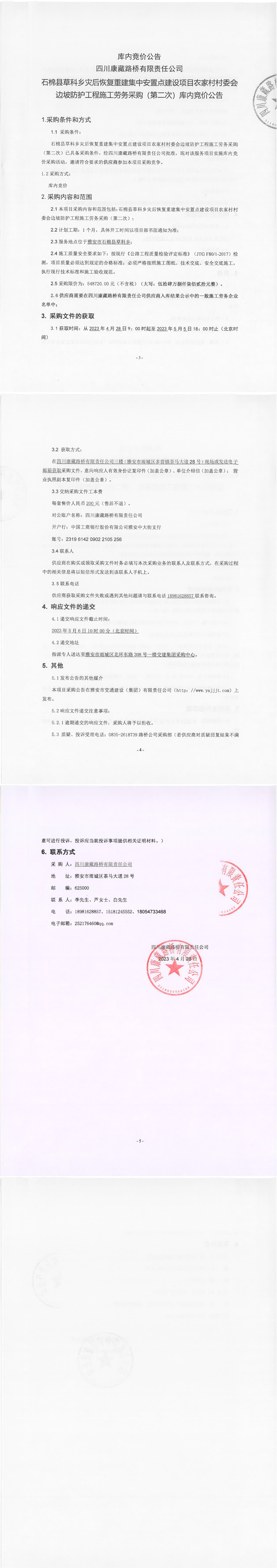 四川康藏路橋有限責(zé)任公司石棉草科鄉(xiāng)災(zāi)后恢復(fù)重建集中安置點(diǎn)建設(shè)項(xiàng)目農(nóng)家村村委會邊坡防護(hù)工程施工勞務(wù)采購(第二次)庫內(nèi)競價(jià)公告