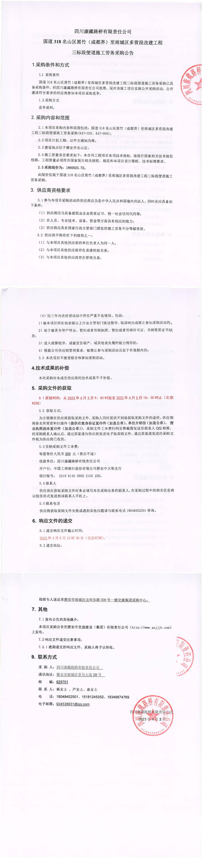四川康藏路橋有限責(zé)任公司國(guó)道318名山區(qū)黑竹(成都界)至雨城區(qū)多營(yíng)段改建工程三標(biāo)段橋梁施工勞務(wù)采購(gòu)公告