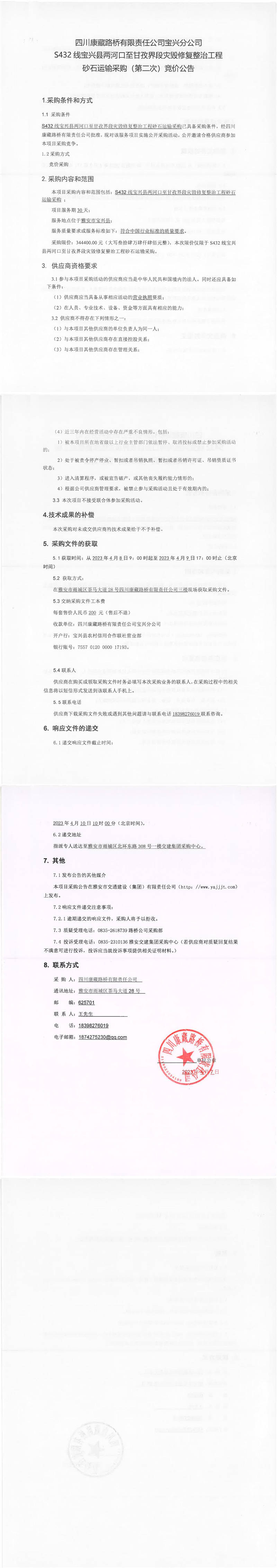 四川康藏路橋有限責(zé)任公司寶興分公司S432寶興縣兩河口至甘孜界段災(zāi)毀修復(fù)整治工程砂石運(yùn)輸采購(第二次)競價(jià)公告