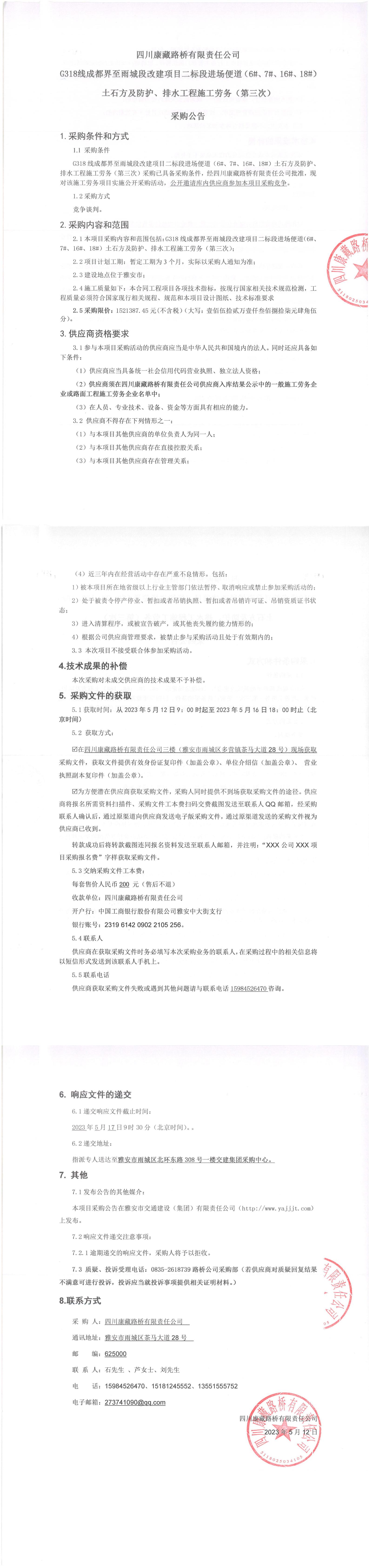 四川康藏路橋有限責(zé)任公司G318線成都至雨城段改建項目二標(biāo)段進場便道(6#、7#、16#、18#)土石方及防護、排水工程施工勞務(wù)(第三次)采購公告