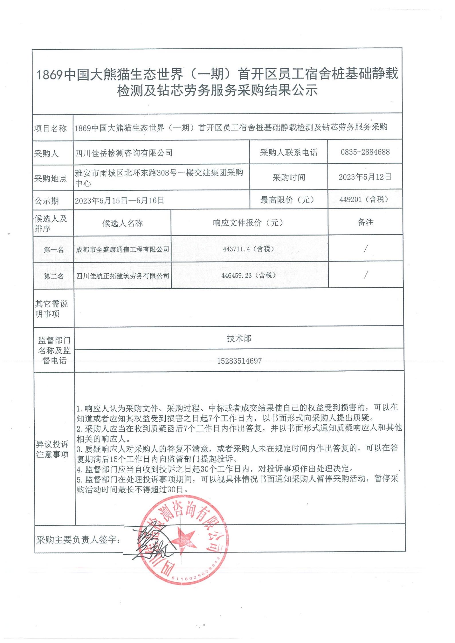 四川佳岳檢測咨詢有限公司關(guān)于1869中國大熊貓生態(tài)世界(一期)首開區(qū)員工宿舍樁基礎(chǔ)靜載檢測勞務(wù)及鉆芯項目中標(biāo)結(jié)果公示