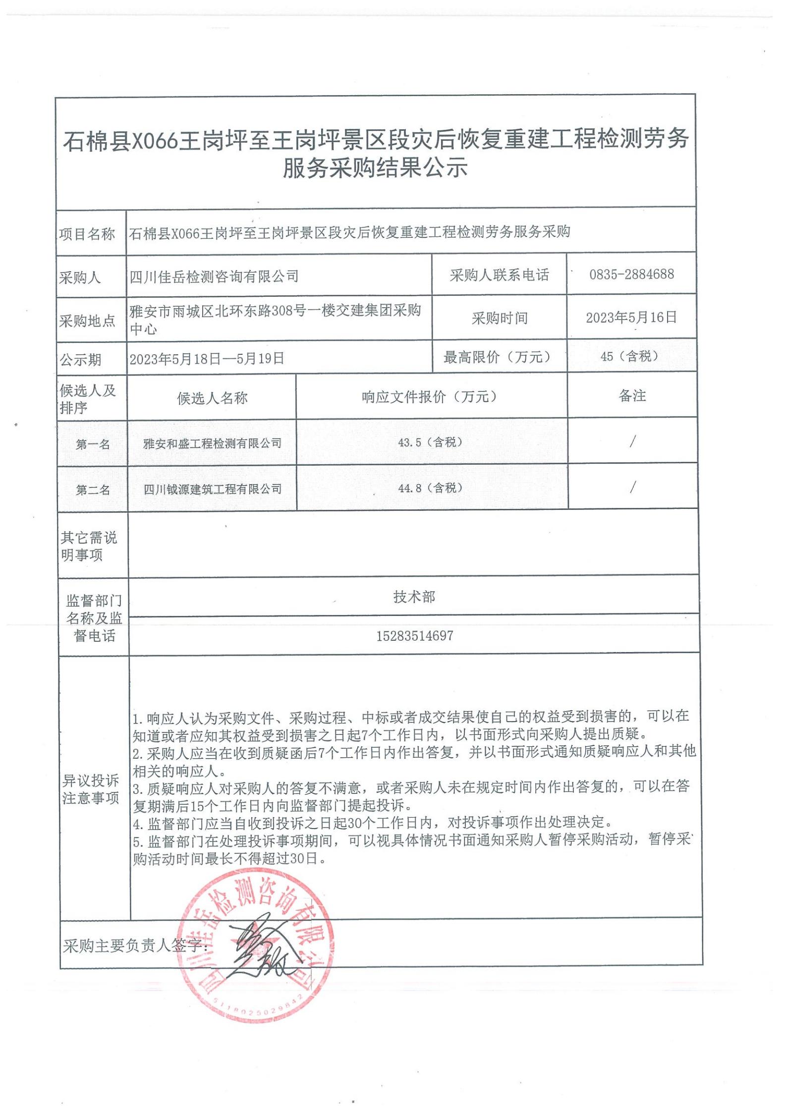 四川佳岳檢測咨詢有限公司石棉縣X066王崗坪至王崗坪景區(qū)段災后恢復重建工程檢測勞務服務采購結果公示