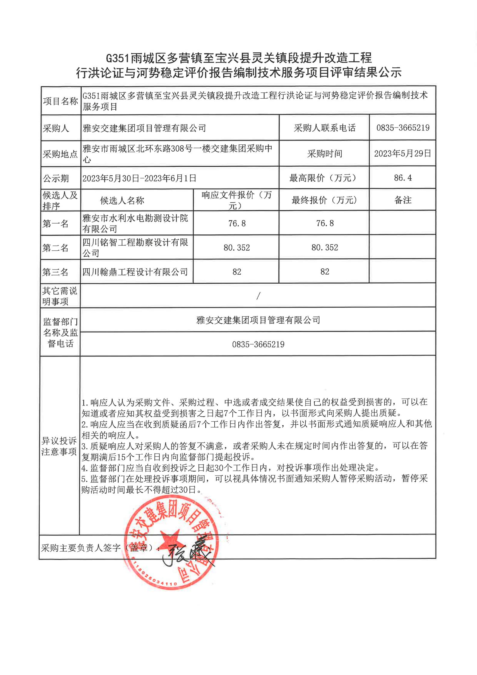 雅安交建集團(tuán)項目管理有限公司G351雨城區(qū)多營鎮(zhèn)至寶興縣靈關(guān)鎮(zhèn)段提升改造工程行洪論證與河勢穩(wěn)定評價報告編制技術(shù)服務(wù)項目評審結(jié)果公示