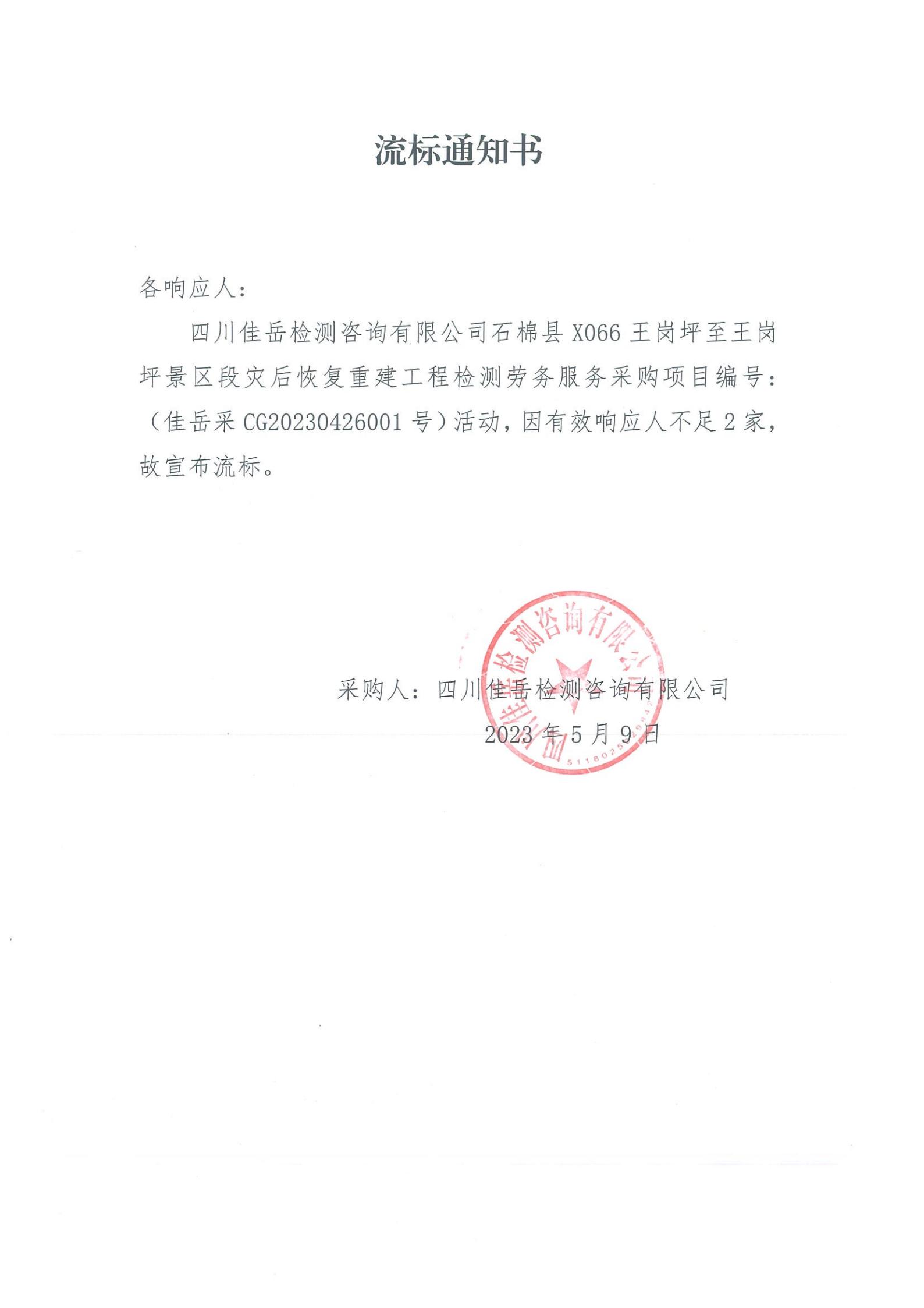 四川佳岳檢測咨詢有限公司石棉縣X066王崗坪至王崗坪景區(qū)段災(zāi)后恢復(fù)重建工程檢測勞務(wù)服務(wù)流標(biāo)通知