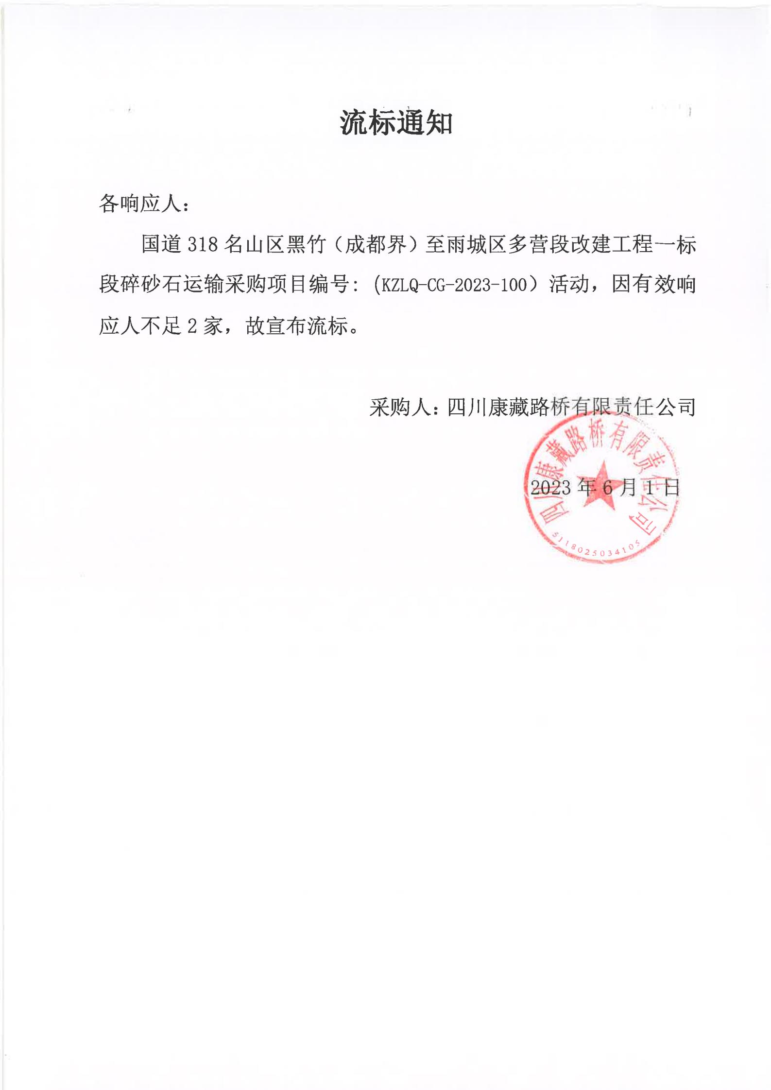 四川康藏路橋有限責(zé)任公司國道318名山區(qū)黑竹(成都界)至雨城區(qū)多營段改建工程一標(biāo)段碎砂石運(yùn)輸采購流標(biāo)通知