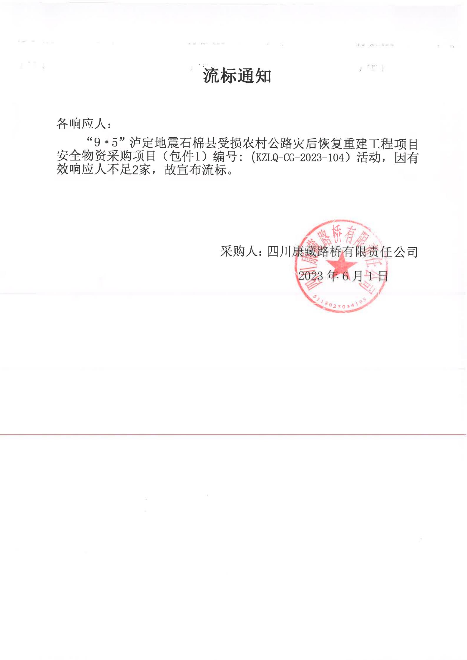 四川康藏路橋有限責(zé)任公司“9·5”瀘定地震石棉縣受損農(nóng)村公路災(zāi)后恢復(fù)重建工程項目安全物資項目(包件1)流標通知