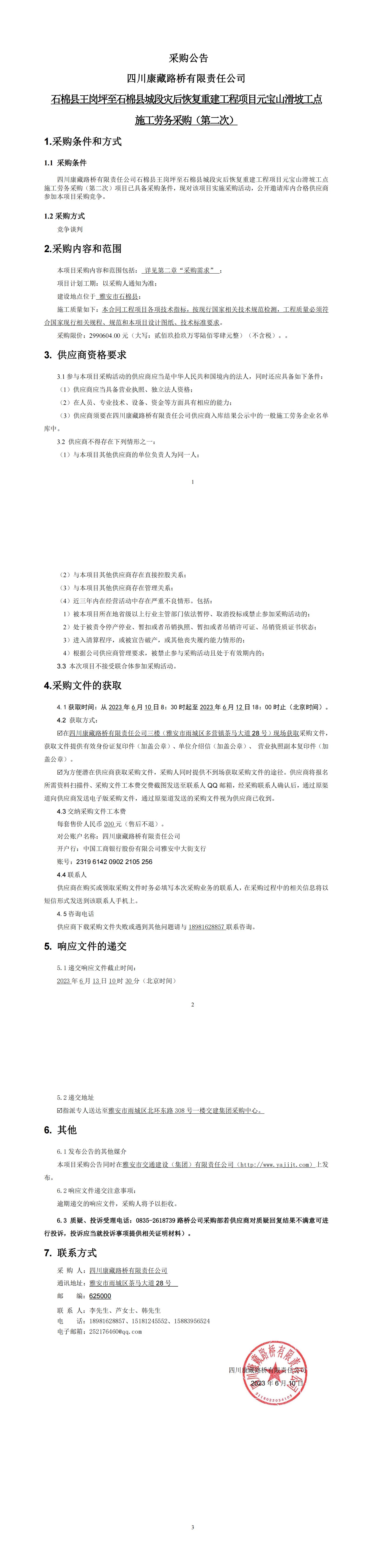 四川康藏路橋有限責(zé)任公司S432線寶興縣兩河口至甘孜界段災(zāi)毀修復(fù)整治工程五龍改線山體邊坡防護施工勞務(wù)庫內(nèi)競價采購結(jié)果公示