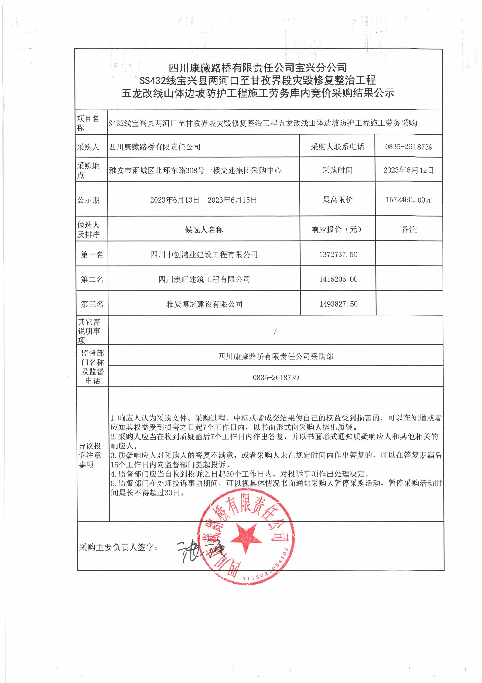 四川康藏路橋有限責任公司S432線寶興縣兩河口至甘孜界段災毀修復整治工程五龍改線山體邊坡防護施工勞務庫內競價采購結果公示