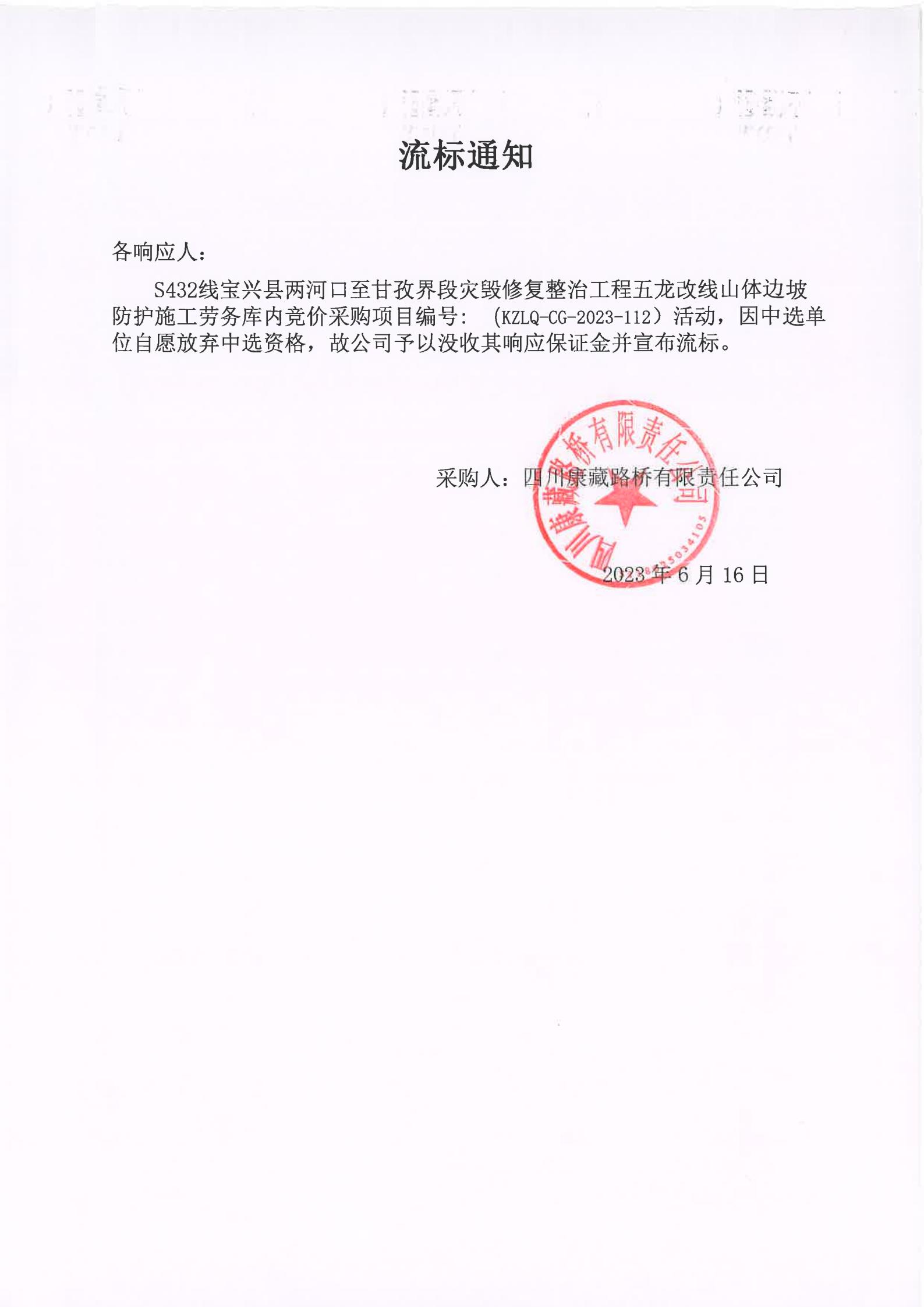 四川康藏路橋有限責(zé)任公司S432線寶興縣兩河口至甘孜界段災(zāi)毀修復(fù)整治工程五龍改線山體邊坡防護(hù)施工勞務(wù)庫內(nèi)競價流標(biāo)通知