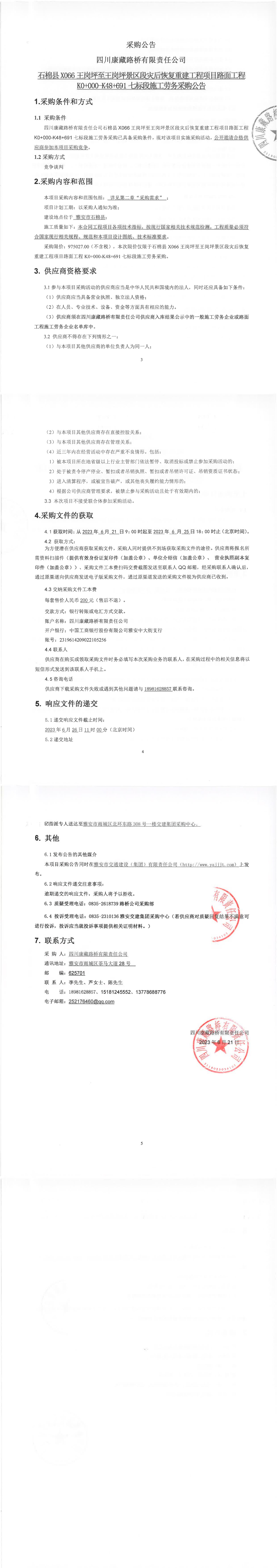 四川康藏路橋有限責(zé)任公司石棉縣X066王崗坪至王崗坪景區(qū)段災(zāi)后恢復(fù)重建工程項(xiàng)目路面工程K0+000-K48+691七標(biāo)段施工勞務(wù)采購公告