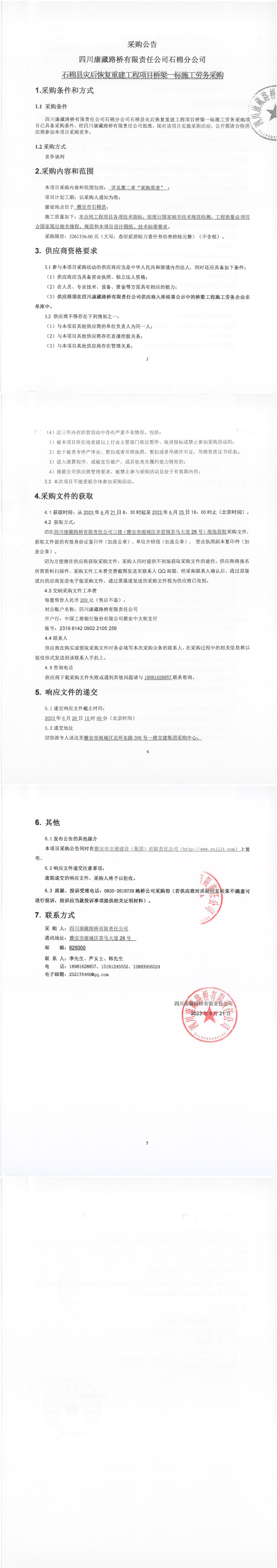 四川康藏路橋有限責(zé)任公司石棉分公司石棉縣災(zāi)后恢復(fù)重建工程項(xiàng)目橋梁一標(biāo)段施工勞務(wù)采購公告