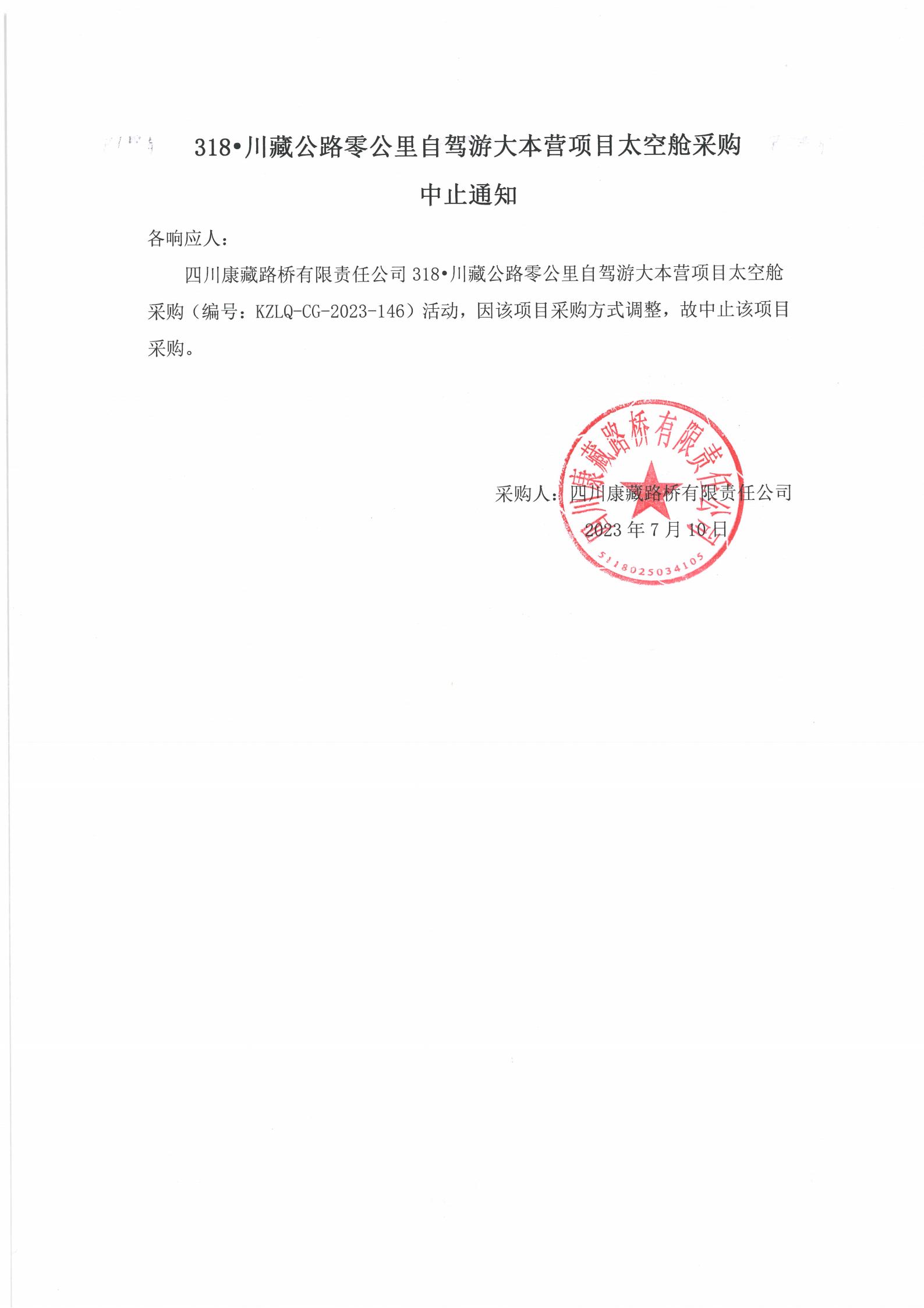 四川康藏路橋有限責(zé)任公司318·川藏公路零公里自駕游大本營項目太空艙采購中止通知