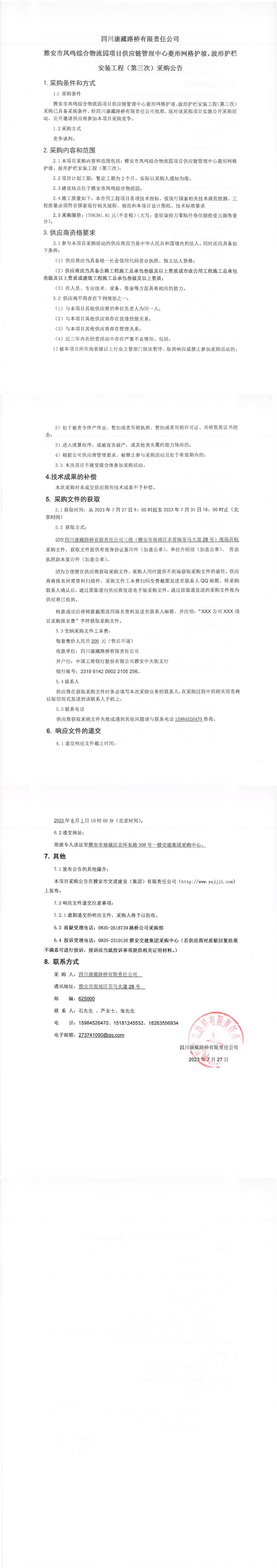 四川康藏路橋有限責(zé)任公司雅安市鳳鳴綜合物流園項(xiàng)目供應(yīng)鏈管理中心菱形網(wǎng)格護(hù)坡、波形護(hù)欄安裝工程(第三次)采購(gòu)公告