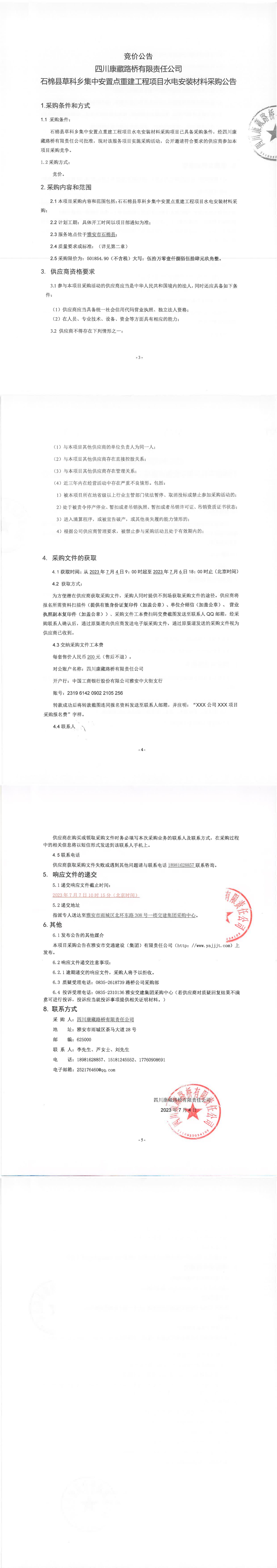 四川康藏路橋有限責(zé)任公司石棉縣草科鄉(xiāng)集中安置點(diǎn)重建工程項(xiàng)目水電安裝材料采購公告