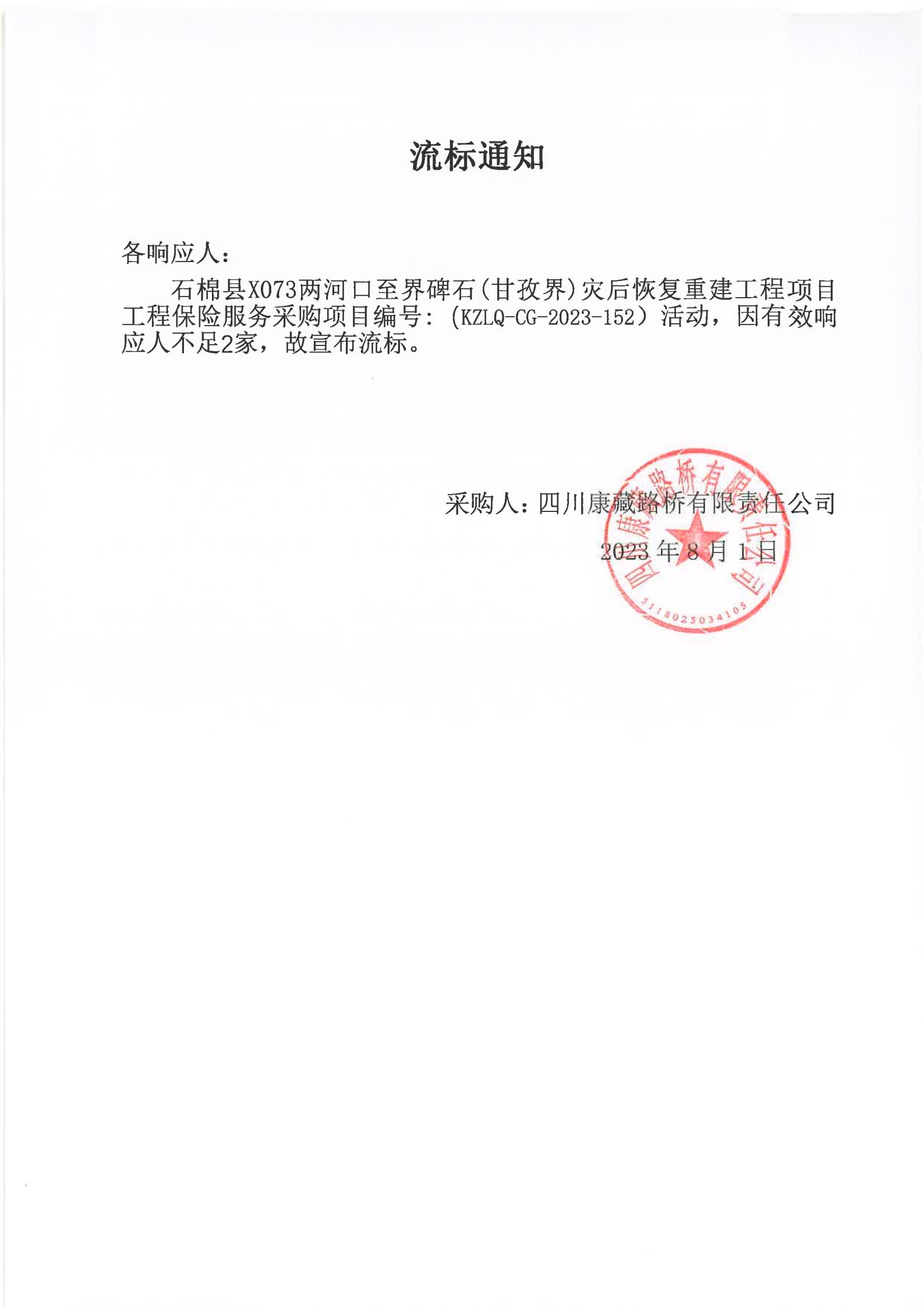 四川康藏路橋有限責(zé)任公司石棉分公司石棉縣X073兩河口至界碑石(甘孜界)災(zāi)后恢復(fù)重建工程項(xiàng)目工程保險(xiǎn)服務(wù)采購項(xiàng)目流標(biāo)通知
