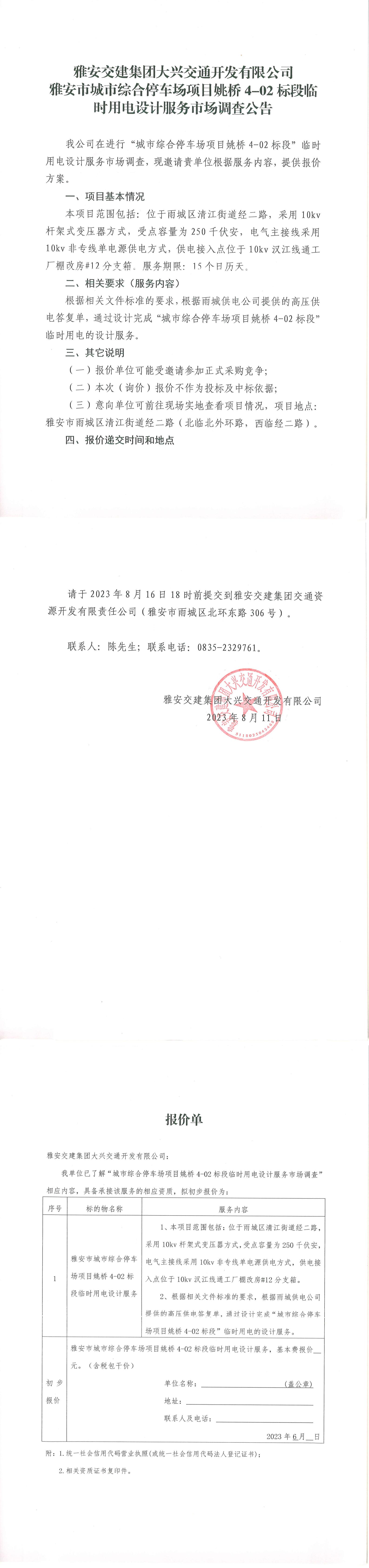 雅安交建集團(tuán)大興交通開(kāi)發(fā)有限公司雅安市城市綜合停車場(chǎng)項(xiàng)目姚橋4-02標(biāo)段臨時(shí)用電設(shè)計(jì)服務(wù)市場(chǎng)調(diào)查公告