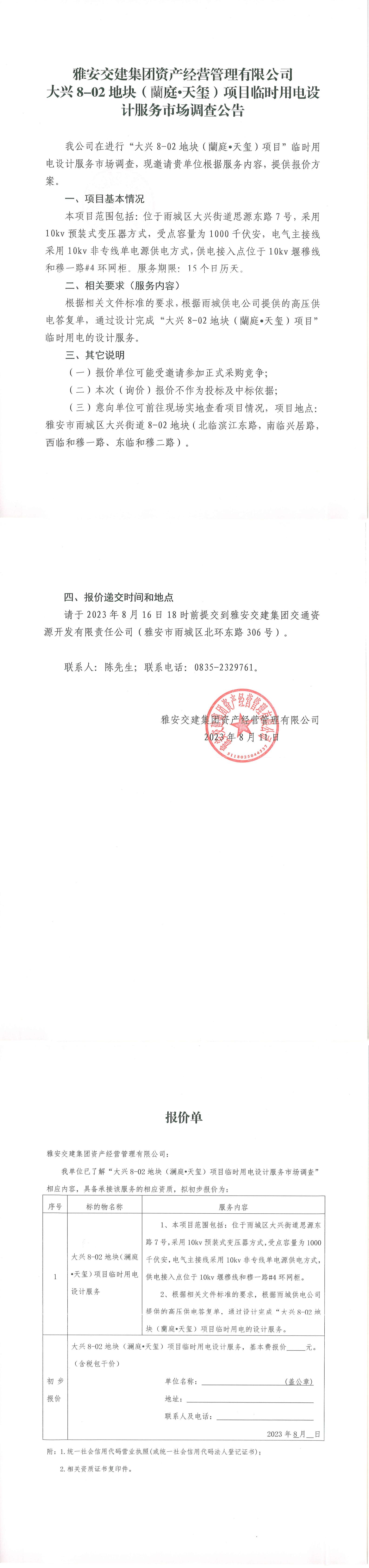 雅安交建集團(tuán)資產(chǎn)經(jīng)營管理有限公司大興8-02地塊(蘭庭·天璽)項目臨時用電設(shè)計服務(wù)市場調(diào)查公告