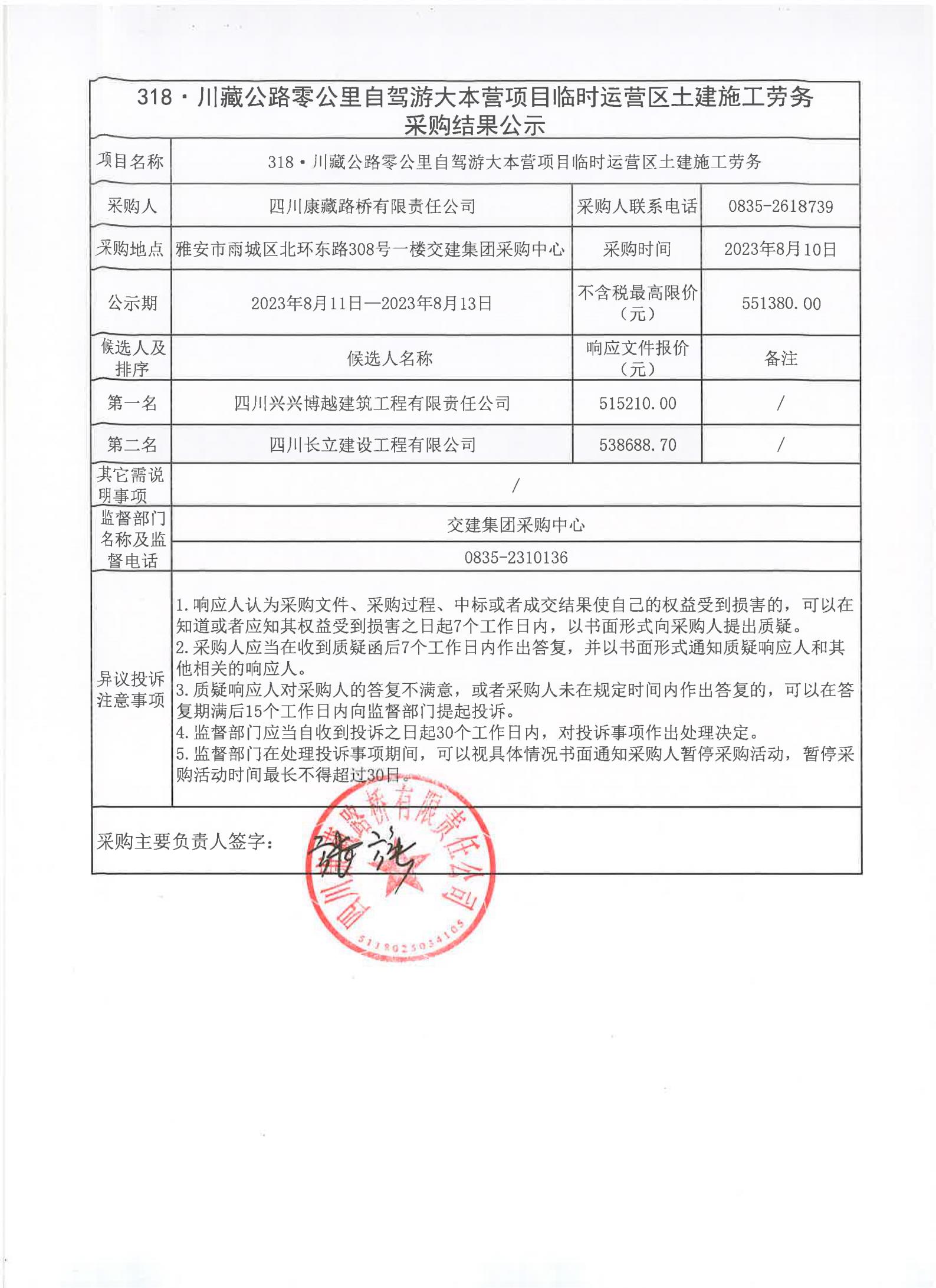 四川康藏路橋有限責任公司318·川藏公路零公里自駕游大本營項目臨時運營區(qū)土建施工勞務采購結果公示