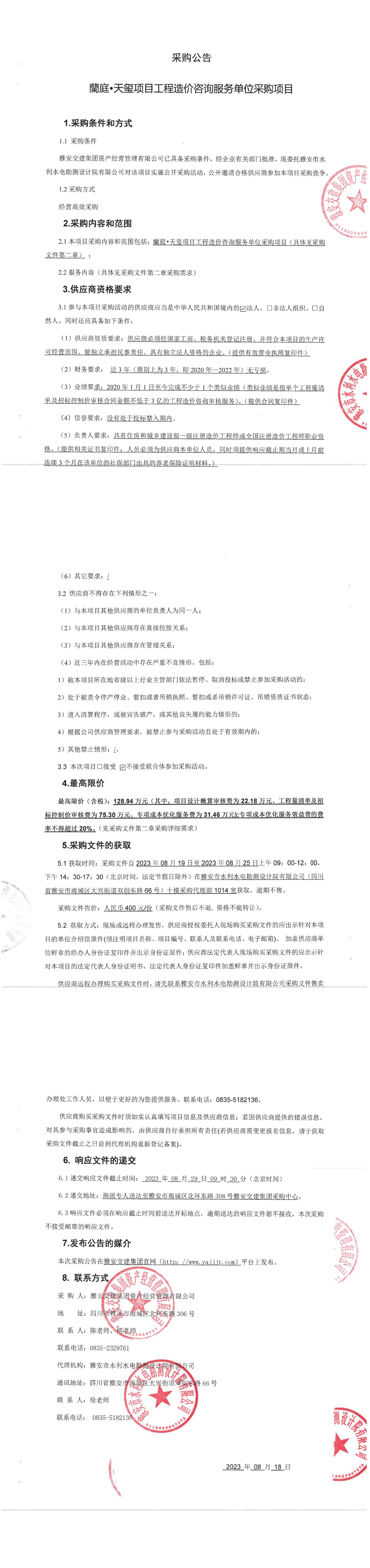 雅安交建集團資產(chǎn)經(jīng)營管理有限公司蘭庭·天璽項目工程造價咨詢服務單位采購項目采購公告