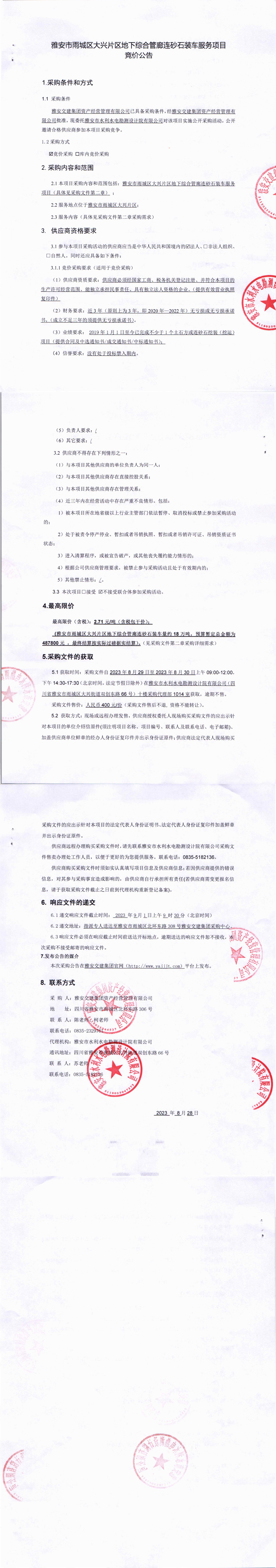 雅安交建集團資產經營管理有限公司雅安市雨城區(qū)大興片區(qū)地下綜合管廊連砂石裝車服務項目競價公告