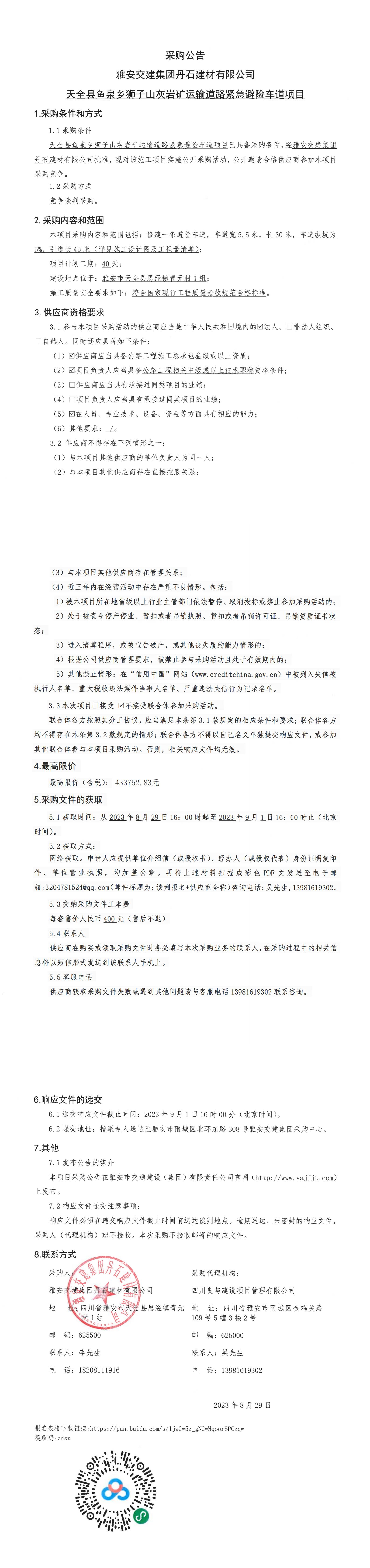 雅安交建集團(tuán)丹石建材有限公司天全縣魚泉鄉(xiāng)獅子山灰?guī)r礦運輸?shù)缆肪o急避險車道項目采購公告