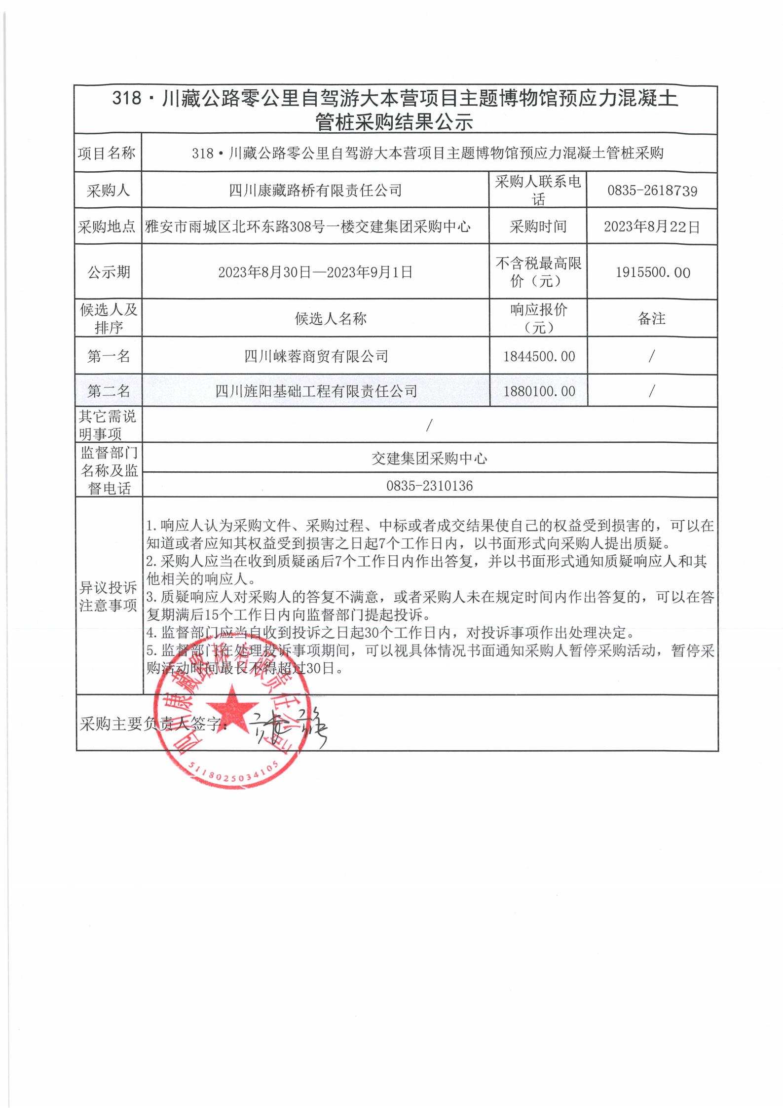 四川康藏路橋有限責(zé)任公司318·川藏公路零公里自駕游大本營(yíng)項(xiàng)目主題博物館預(yù)應(yīng)力混凝土管樁采購(gòu)結(jié)果公示