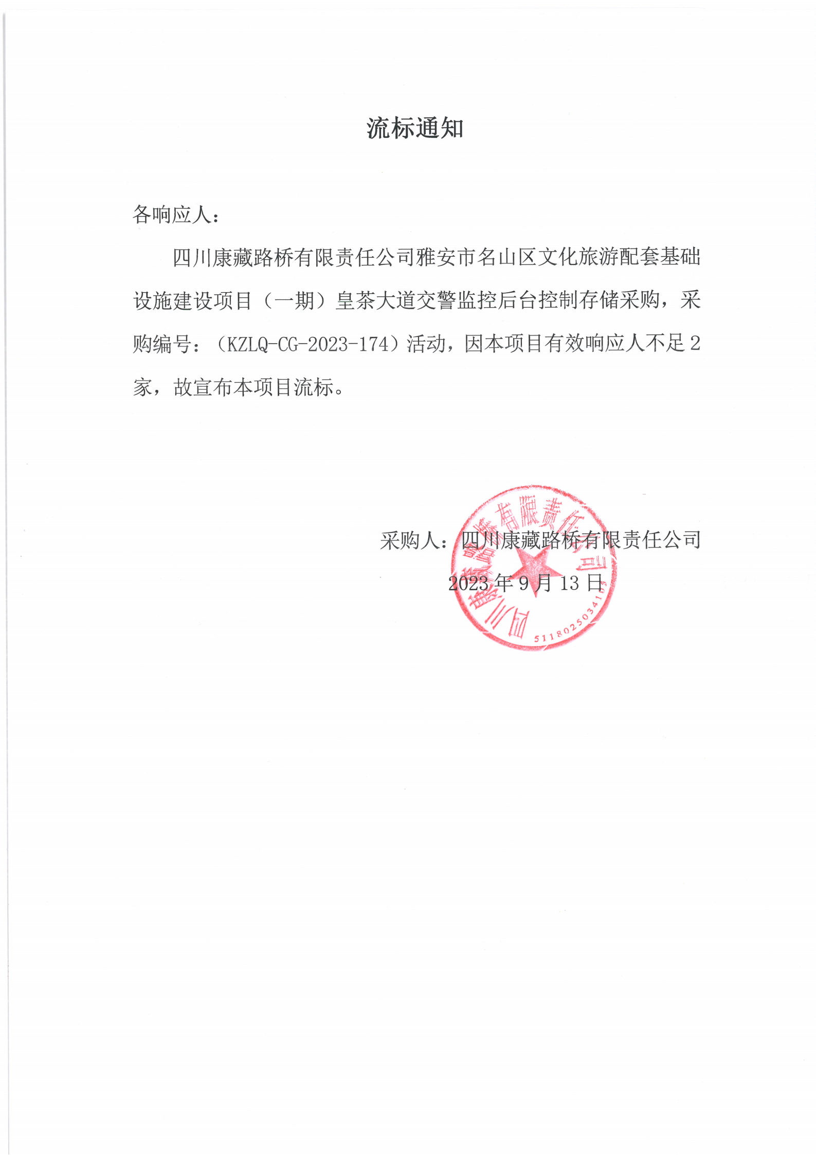 四川康藏路橋有限責(zé)任公司雅安市名山區(qū)文化旅游配套基礎(chǔ)設(shè)施建設(shè)項(xiàng)目(一期)皇茶大道交警監(jiān)控后臺(tái)控制存儲(chǔ)采購(gòu)流標(biāo)通知