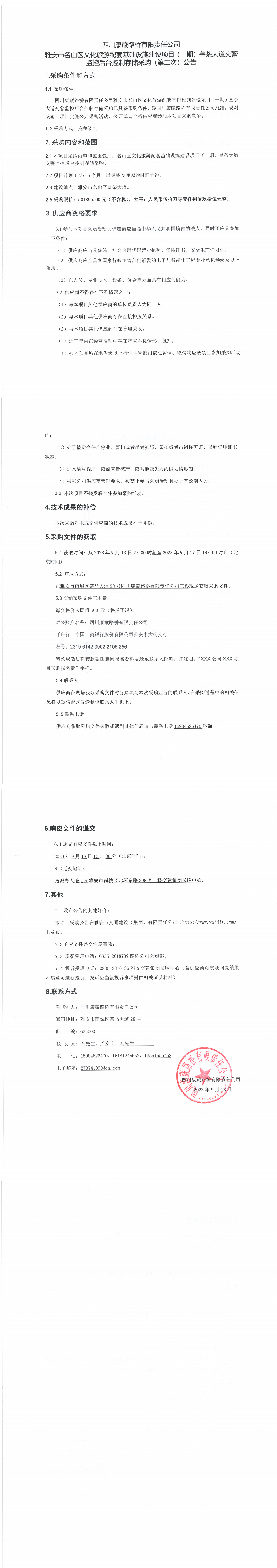 四川康藏路橋有限責(zé)任公司雅安市名山區(qū)文化旅游配套基礎(chǔ)設(shè)施建設(shè)項(xiàng)目(一期)皇茶大道交警監(jiān)控后臺控制存儲采購(第二次)公告