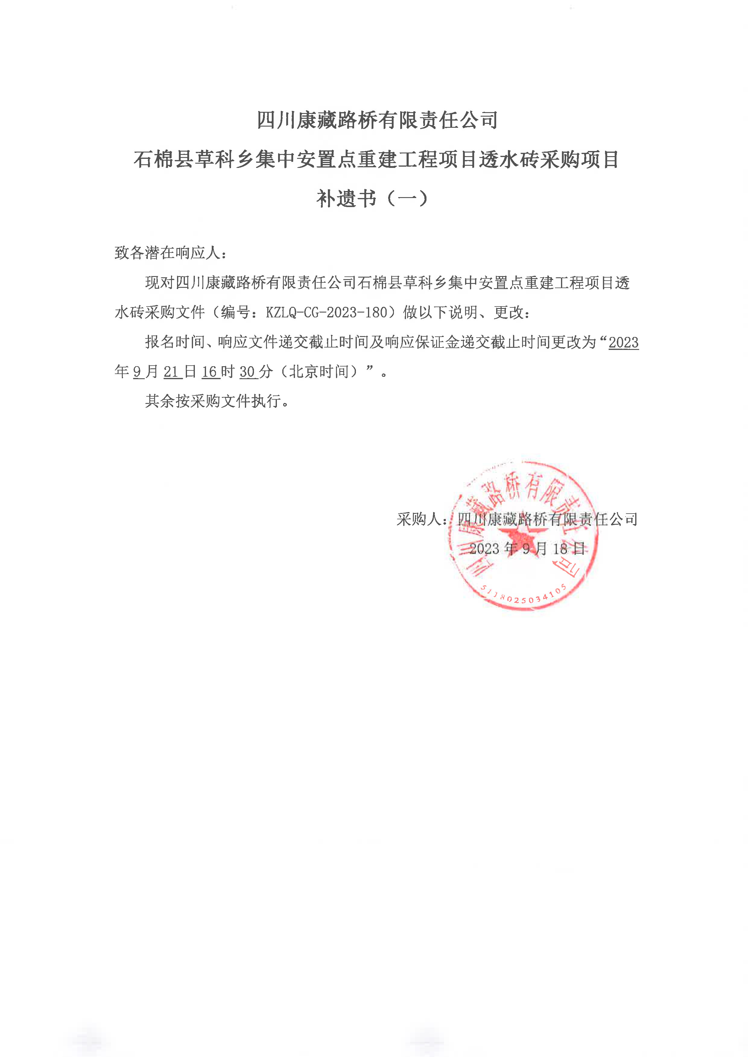 四川康藏路橋有限責(zé)任公司石棉縣草科鄉(xiāng)集中安置點重建工程項目透水磚采購項目補遺書(一)