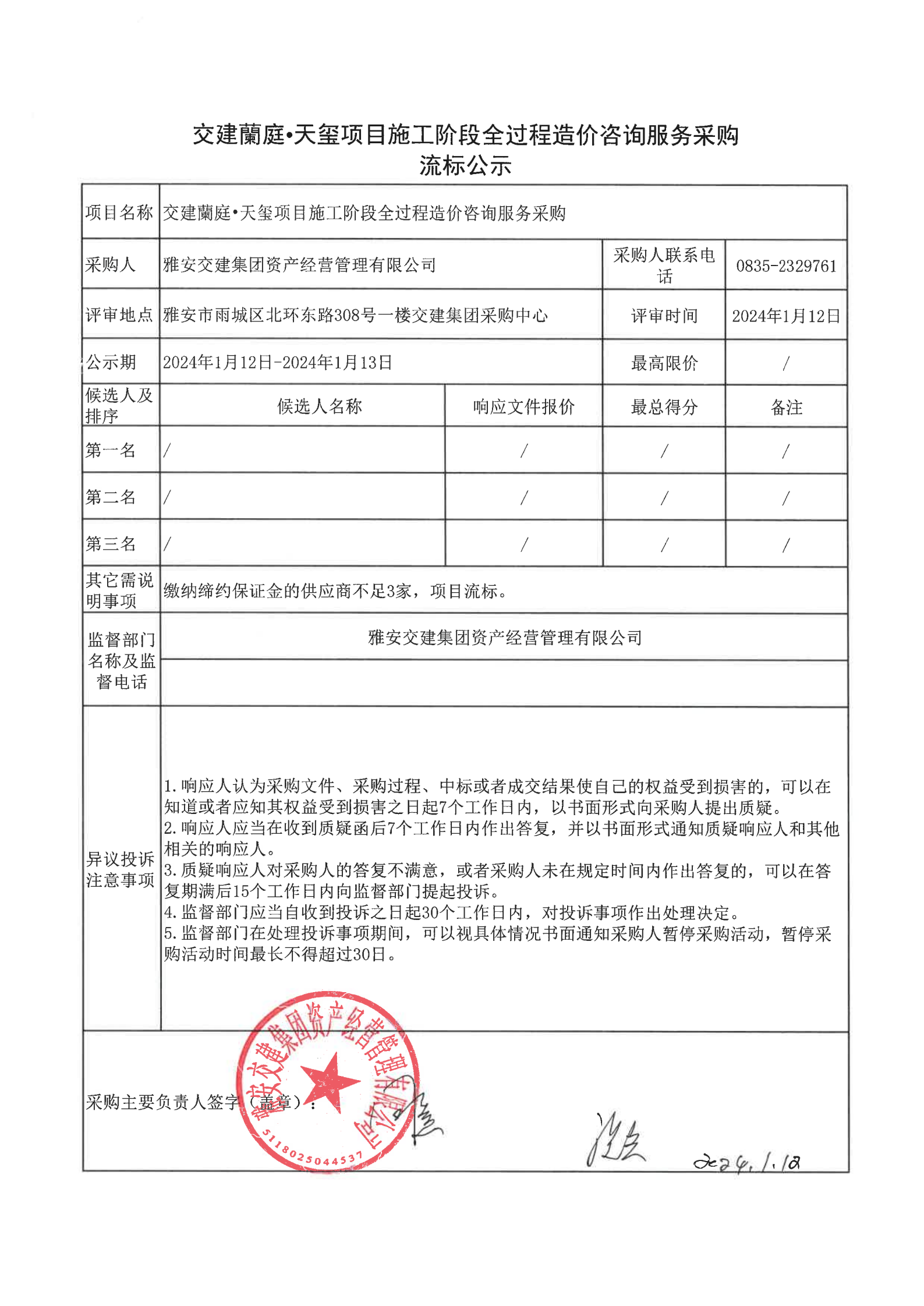雅安交建集團(tuán)資產(chǎn)經(jīng)營管理有限公司交建蘭庭·天璽項目施工階段全過程造價咨詢服務(wù)采購流標(biāo)公示