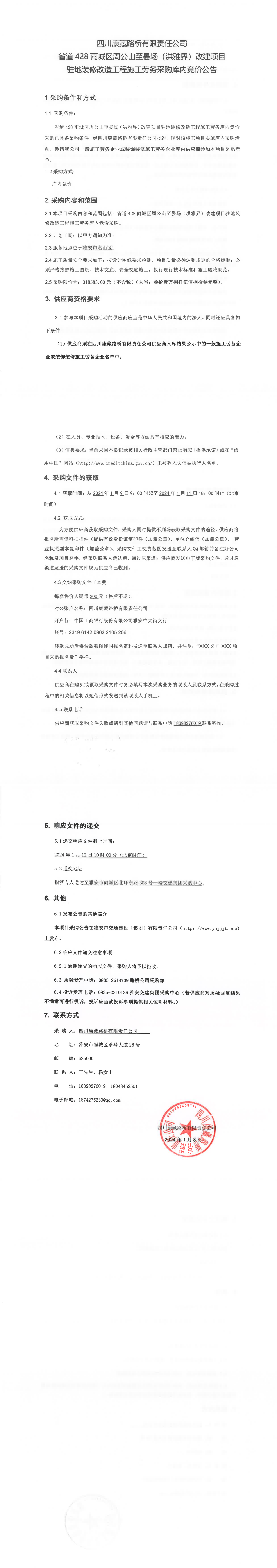 四川康藏路橋有限責(zé)任公司省道428雨城區(qū)周公山至晏場(chǎng)(洪雅界)改建項(xiàng)目駐地裝修改造工程施工勞務(wù)采購(gòu)庫(kù)內(nèi)競(jìng)價(jià)公告