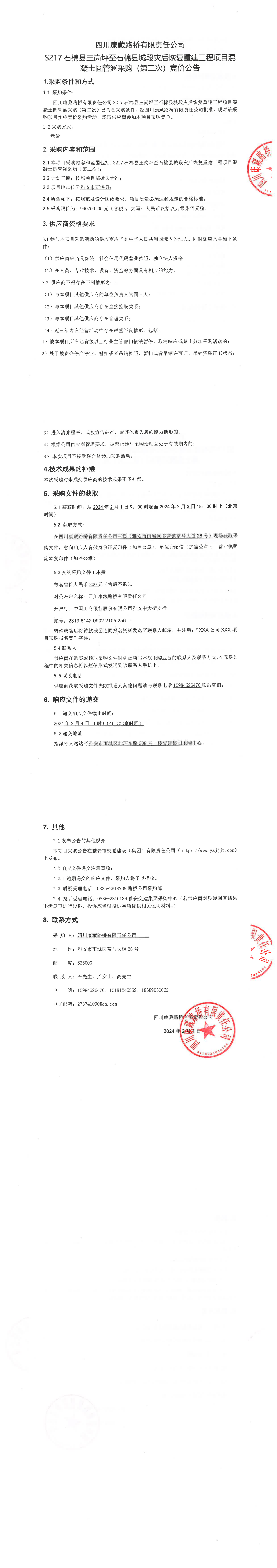 四川康藏路橋有限責任公司S217石棉縣王崗坪至石棉縣城段災后恢復重建工程項目混凝土圓管涵采購(第二次)競價公告