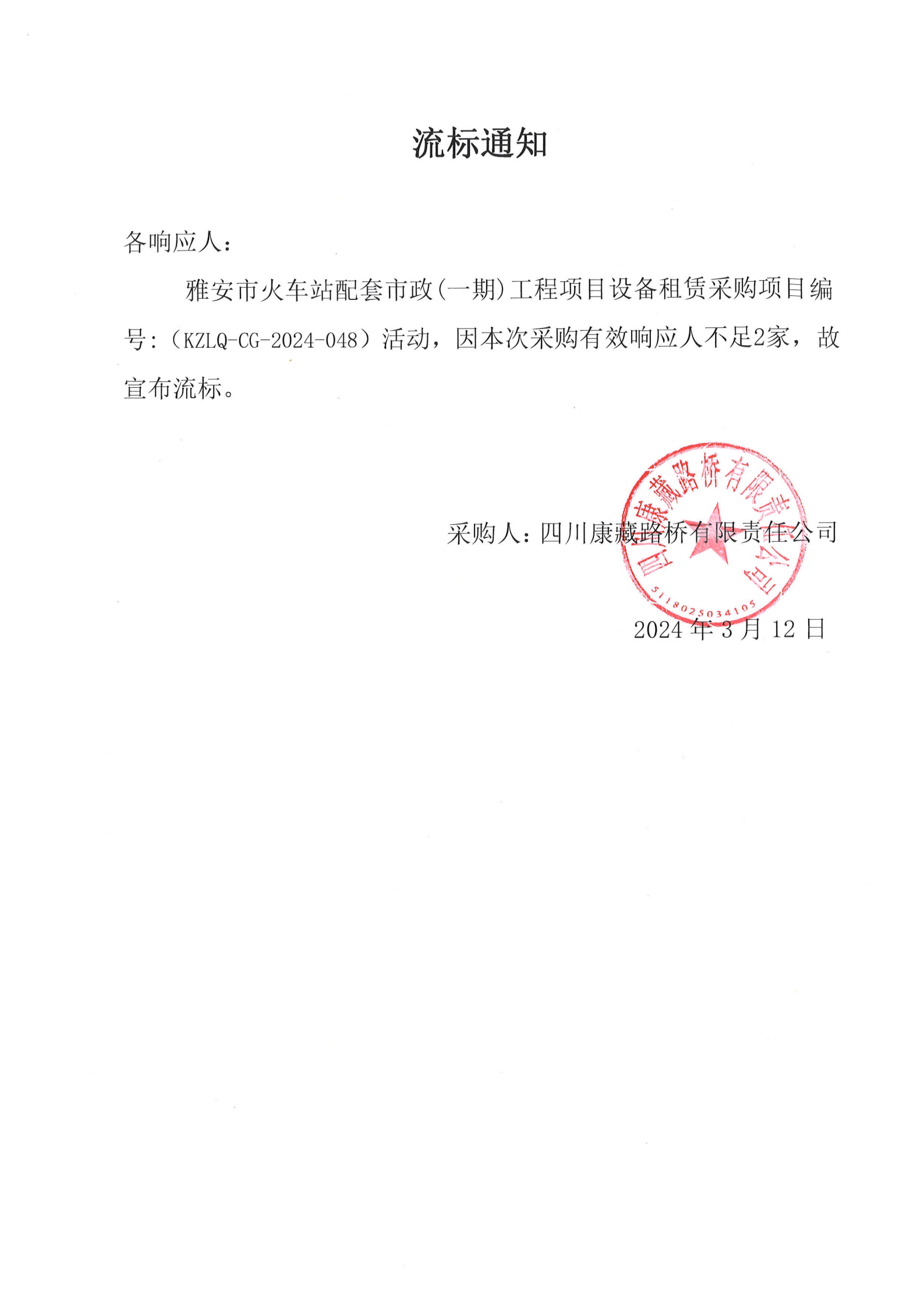 四川康藏路橋有限責(zé)任公司雅安市火車站配套市政(一期)工程項(xiàng)目設(shè)備租賃采購流標(biāo)通知