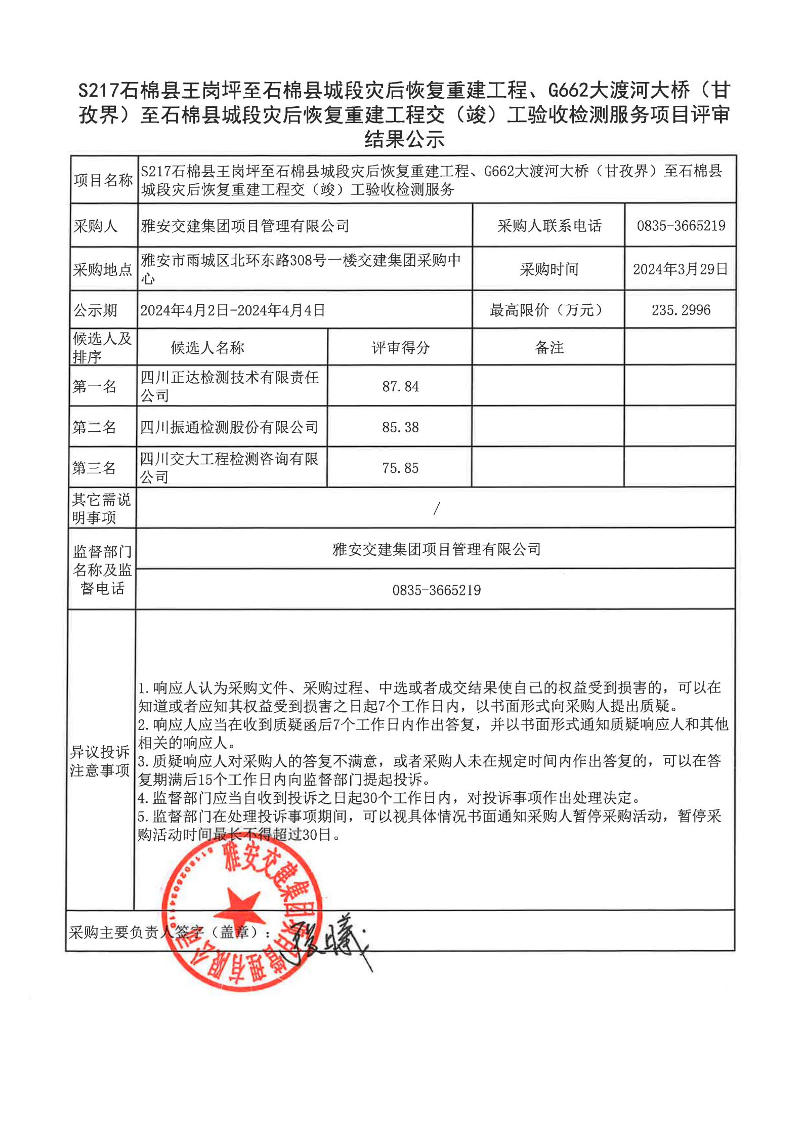 雅安交建集團項目管理有限公司S217石棉縣王崗坪至石棉縣城段災后恢復重建工程、G662大渡河大橋(甘孜界)至石棉縣城段災后恢復重建工程交(竣)工驗收檢測服務(wù)項目評審結(jié)果公示